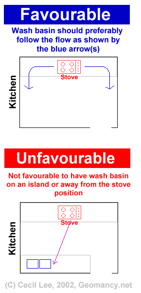 For safety reasons (not so much of Feng Shui); the wash basin should preferably be positioned such that after cooking eg. hot utensils can immediately using body motion to swing it towards the stove area to the wash basin. With just a side movement of the body.
